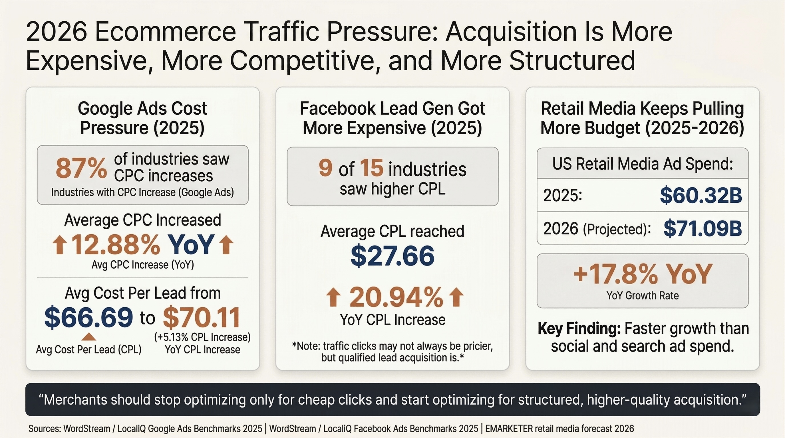 EMARKETER forecasts US retail media ad spend at $60.32B in 2025 and $71.09B in 2026, a 17.8% increase. Brands are still pushing more budget into commerce-linked media rather than backing away from paid acquisition. EMARKETER 2026 Retail Media Forecast