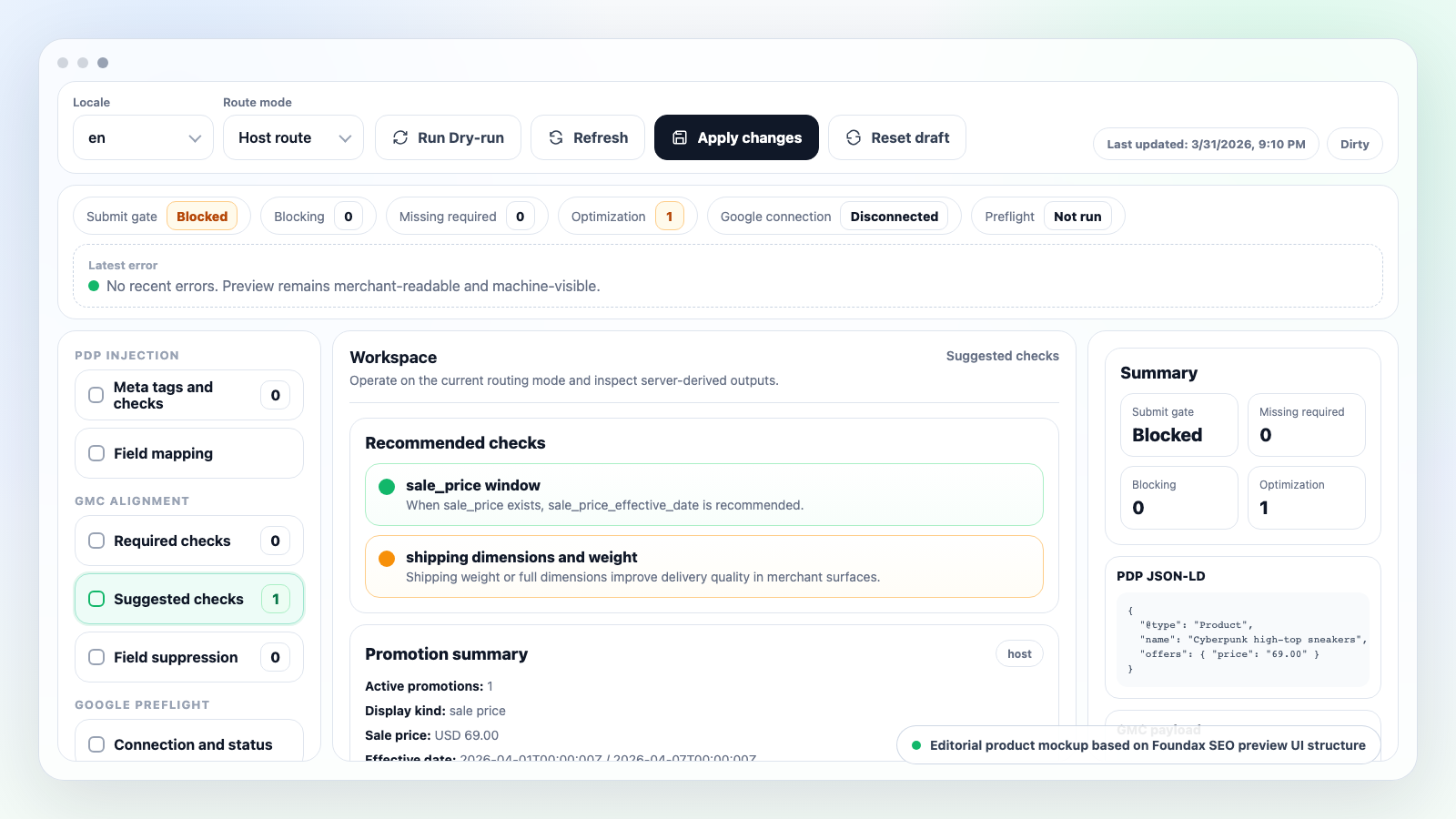 Foundax 在这块的价值,不是简单给商家一个“SEO 已开启”的状态,而是把关键输出尽量做成看得见、查得到、能落地改的工作区: